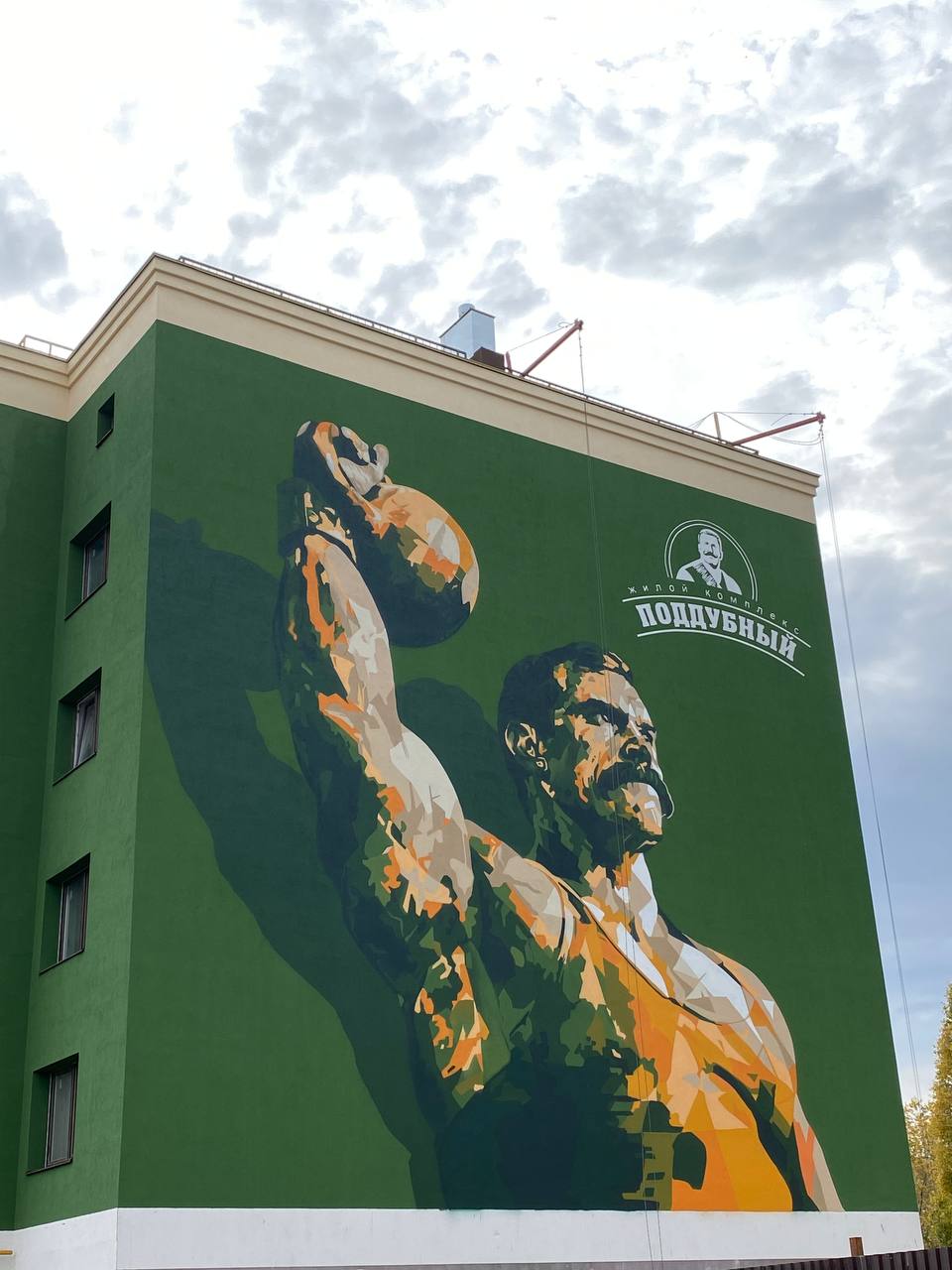 В ознаменование этого дня на фасаде нашего жилого комплекса появился яркий мурал, посвящённый Ивану Поддубному.